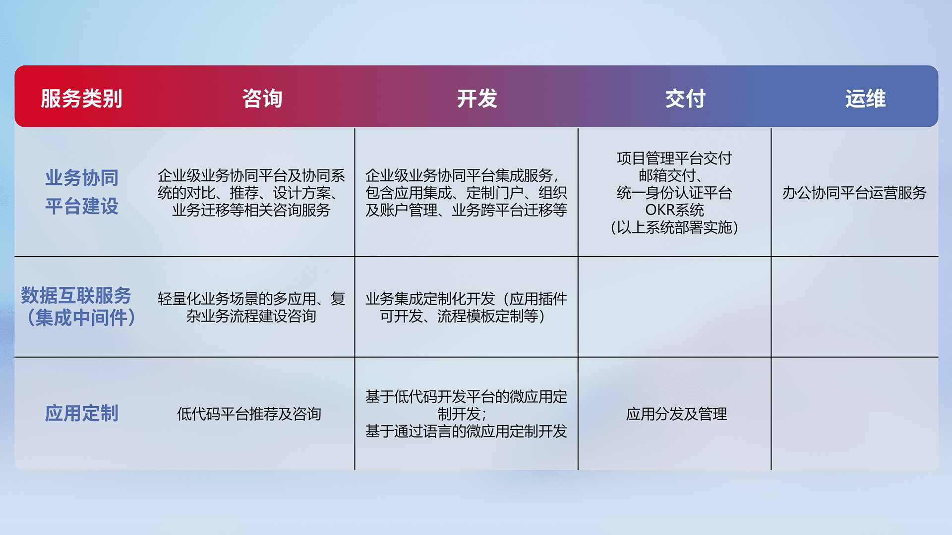 针对钉钉、、企微、、IDaas等平台级产品提供产品的规划、、方案、、、、交付、、定制化开发等服务,,,实现如统一协同办公、、智能客户服务、、、混合会议管理、、智能数据查询、、、等业务场景,,实现数字化转型。。。。