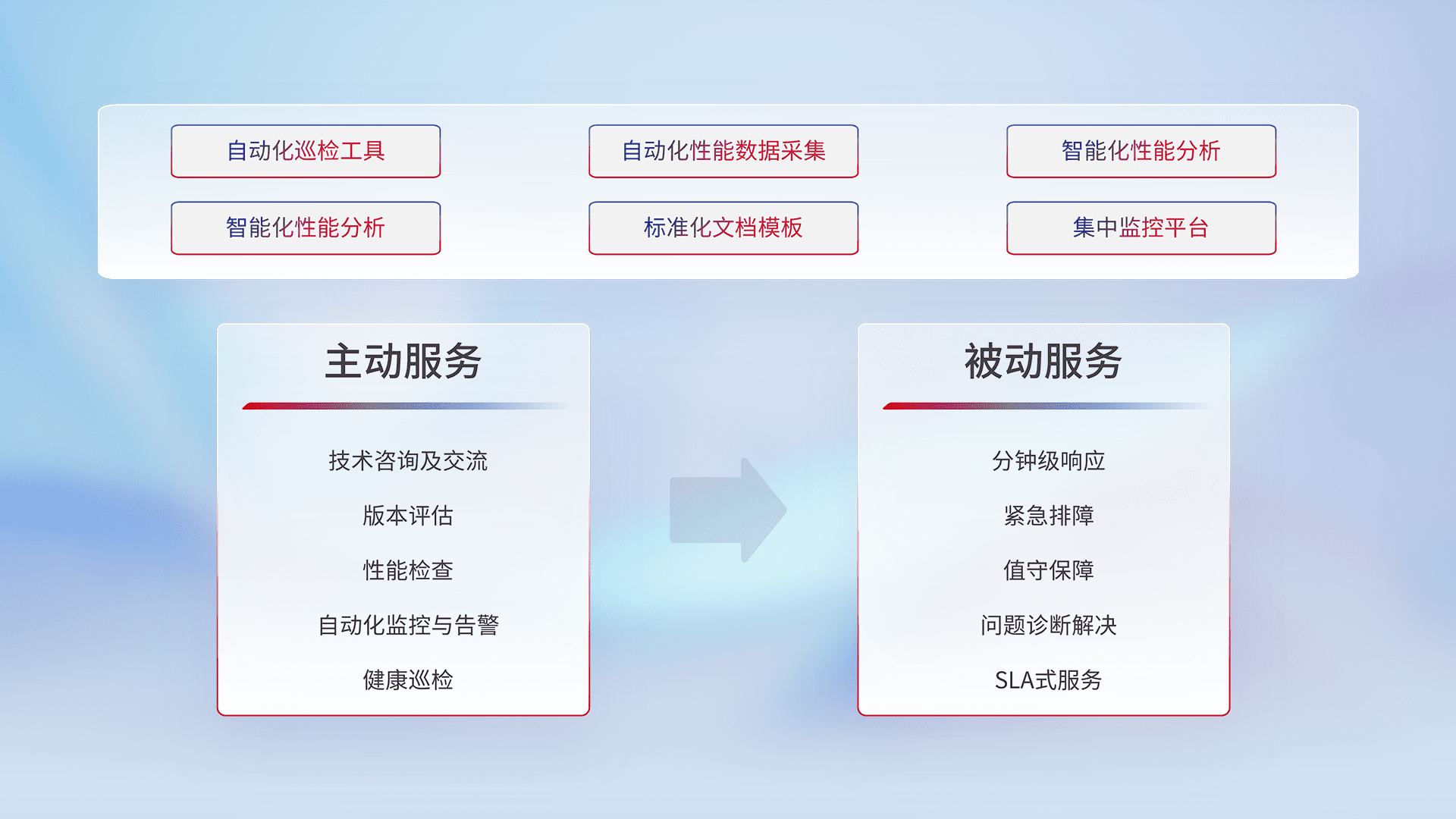智能化工具和标准化文档,,保障服务质量,,提供主动服务(包含技术咨询、、、、版本评估、、、、性能检查、、、自动化监控与告警、、、健康巡检)和被动服务包含(分钟级响应、、紧急排障、、值守保障、、问题诊断解决、、、、SLA服务)。。。。